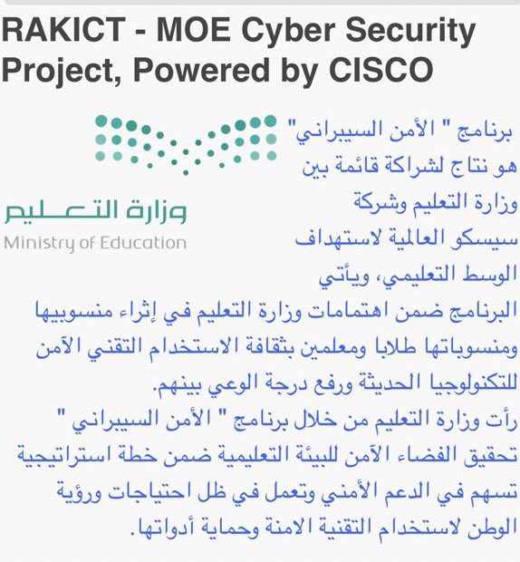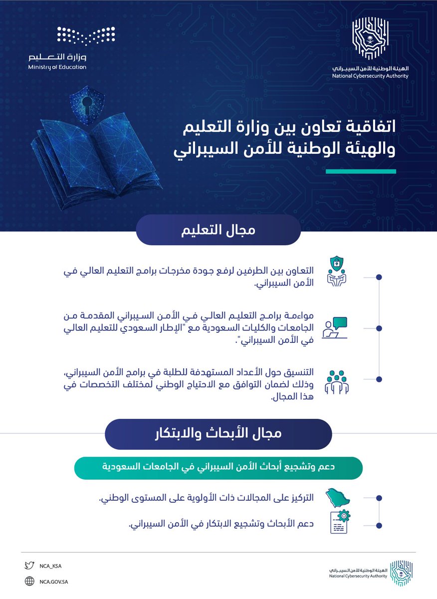 ماجستير العلوم في الأمن السيبراني، والتي تشترط أن يكون الطالب حاصلا على بكالوريوس من أي جامعة أهلية أو حكومية معترف بها في المملكة، جدير بالذكر أن معالي الوزير الدكتور أحمد بن محمد العيسى، أعلن بالتنسيق بين الهيئة الوطنية للأمن السيبراني ووزارة التعليم.
